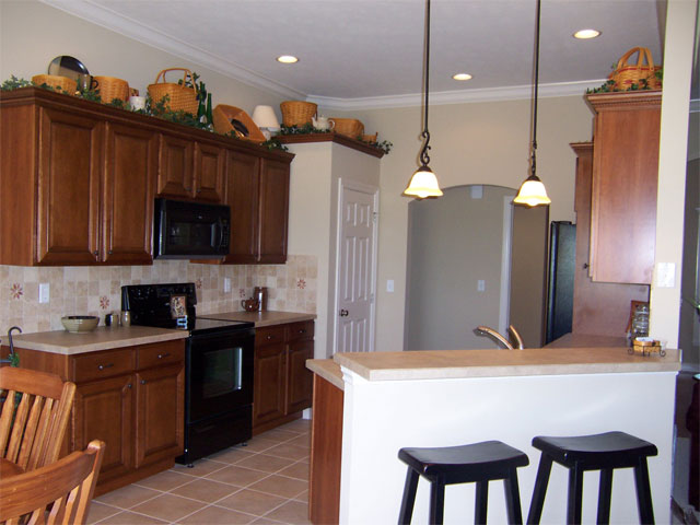 breakfast nook; maple cabinets with limestone backsplash in kitchen;